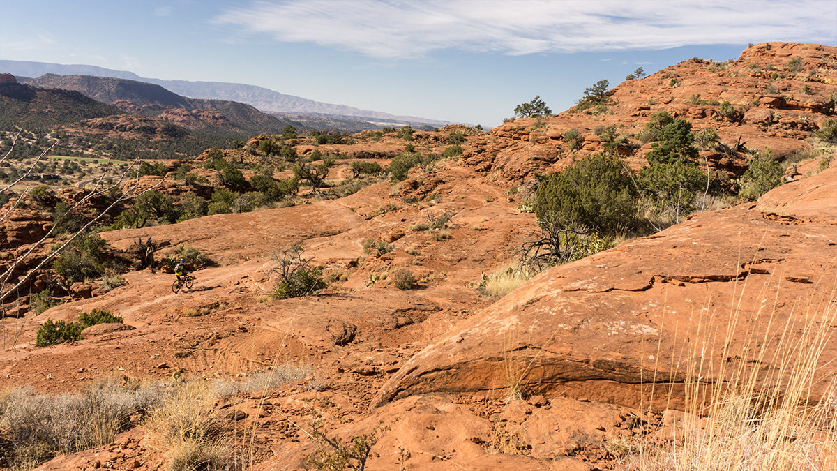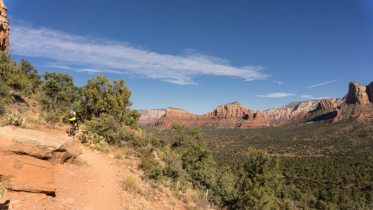 Auf dem Aussichtspunkt angekommen, genießt den Panoramablick auf den Cathedral Rock. Nun wechselt die Hiline ihren Charakter, es wird verdammt flowig. Auf den roten Felsen kann die Bremse offen gelassen werden. Nochmals ordentlich technisch wird das Schlußdrittel.