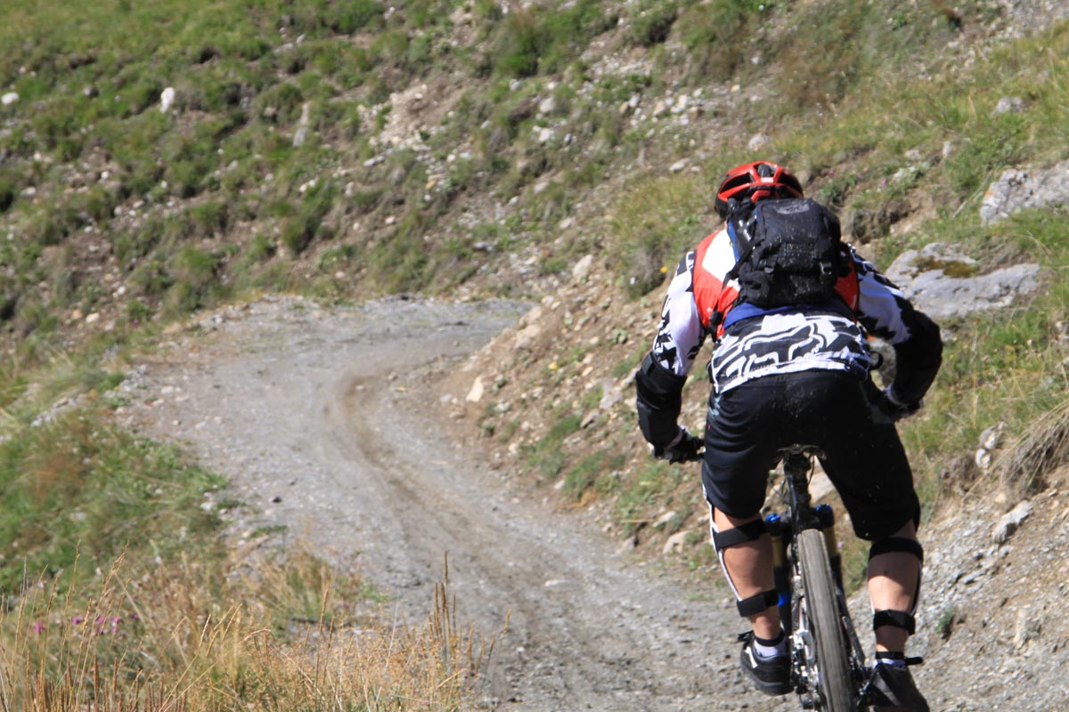 Die kurze Einrollphase bis zum Ortsteil Permont sollte genutzt werden, denn darauf folgt direkt ein recht steiler Schotter-Anstieg in Richtung Eira Pass. Die letzten Meter vor der Asphaltstraße fahren wir auf der Bikepark Line, also auf Gegenverkehr achten. Tipp: kurbelfaule Freunde unserer Zunft nutzen einfach eine Einwegfahrt auf der Mottolino Bahn und stürzen sich gleich ins Trailvergnügen.