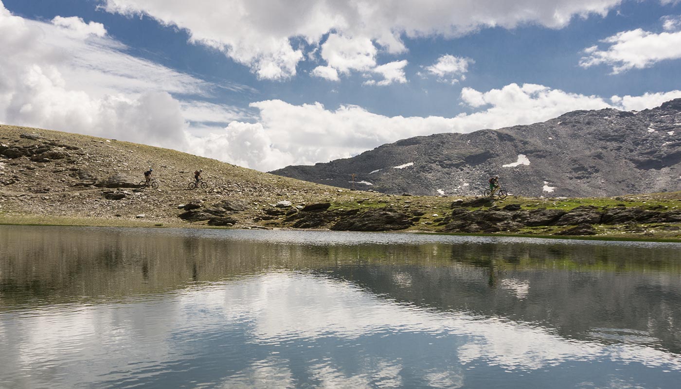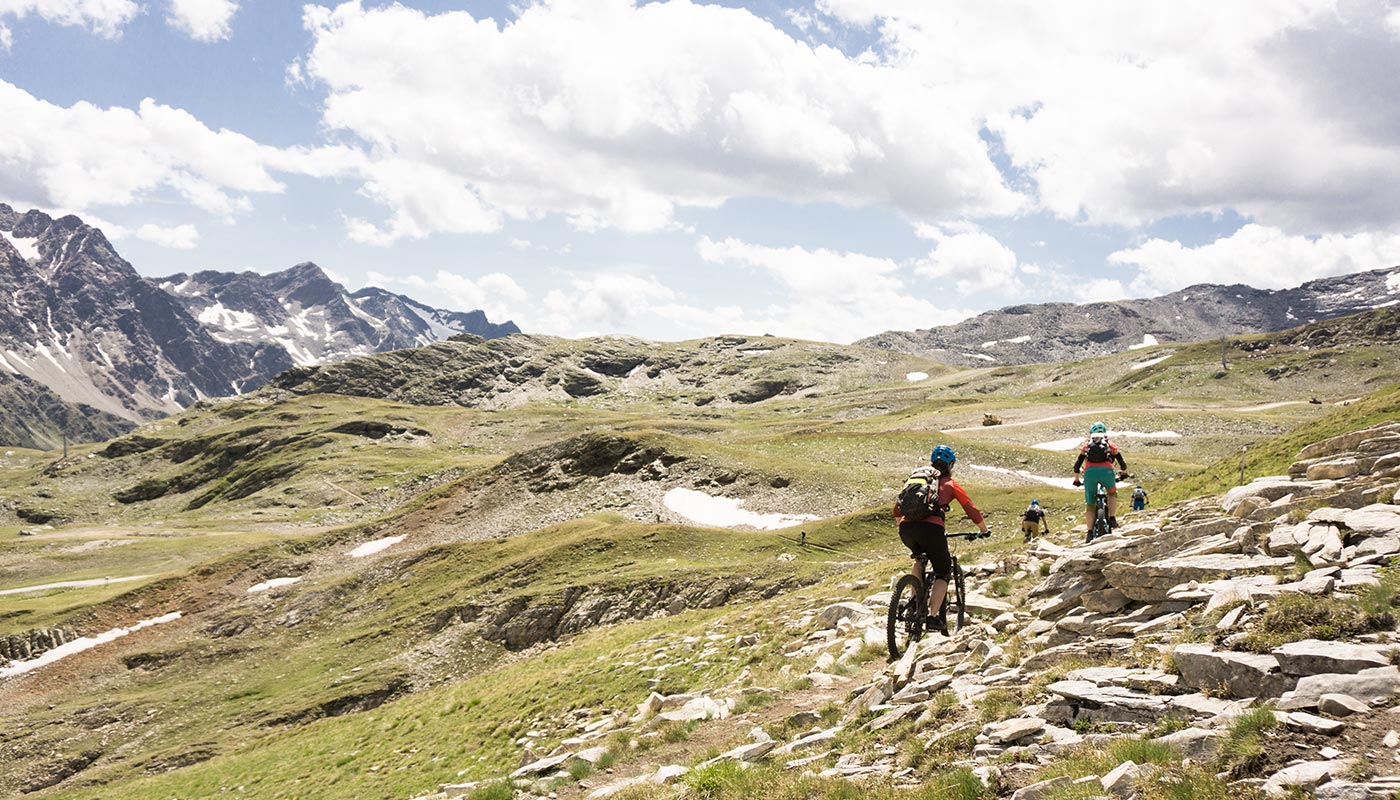 Dann geht's bergauf zum Laghetto, kurz steil über die Skipiste, dann beginnt der Trailspaß bergab. Stage 2 zieht rechts am Bach entlang bis zur Gavia Passstraße: flowig, gespickt mit Steinen lacht das Enduro Herz.