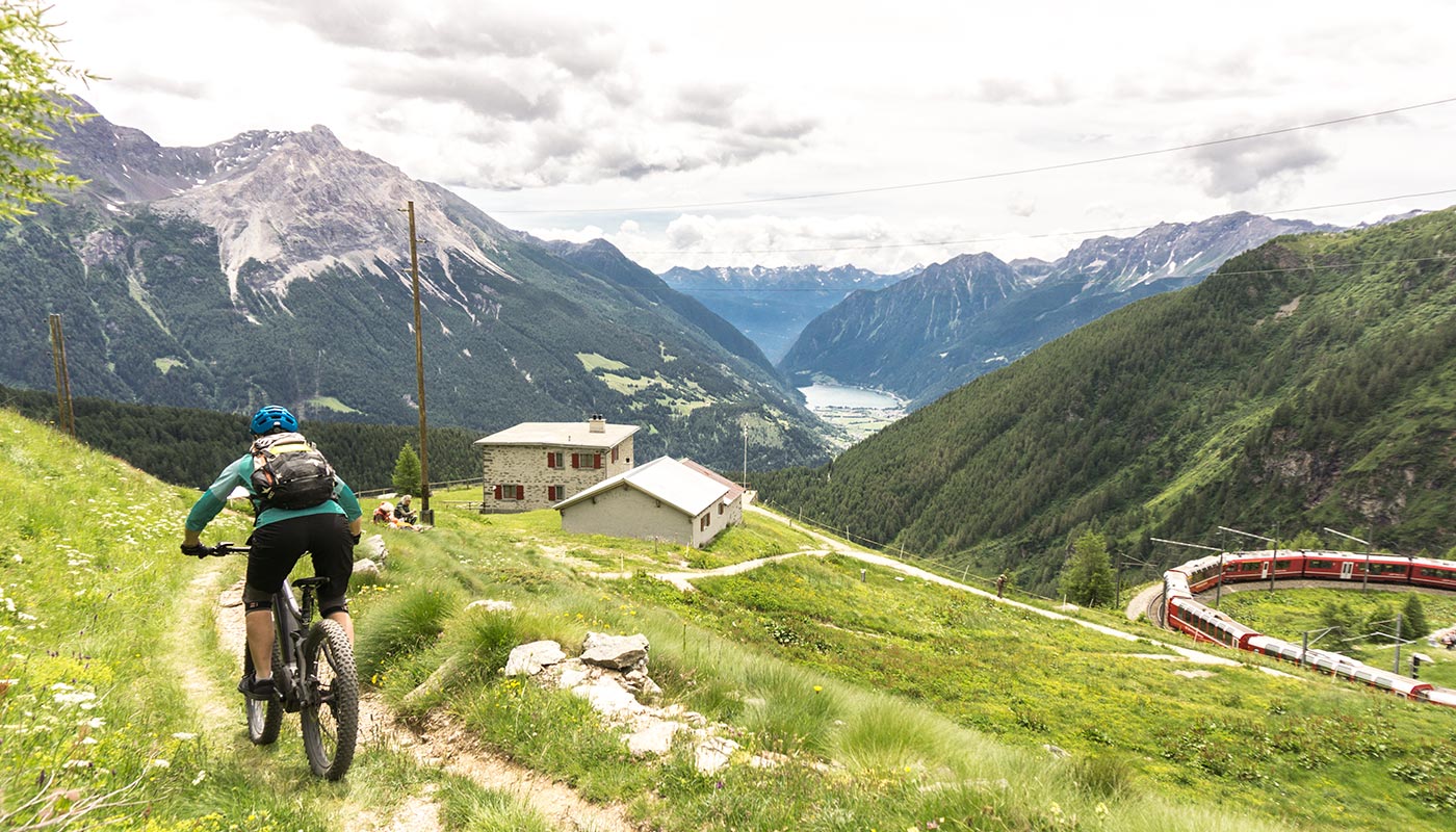 Von Le Prese gehts mit dem bestellten Shuttle in Richtung Col d'Anzana. Die Abfahrt beginnt mit einem wunderschönen Panoramatrail, der an der Bergflanke entlang nach Osten führt. Das Panorama reicht von der Ortlergruppe bis zu den Bergamasker Alpen und tief unten liegt der Talboden des Veltlins. Unendliche Serpentinen mit Trockensteinmauern führen bergab. Ab der Ortschaft Lughina folgt man dem alten Weg mit den grossen Pflastersteinen. Letzterer ist für Fahrtechniker ein wahrer Genuss. Auf den letzten 200 bis 300 Höhenmetern führt die Route durch Obstgärten und Reben hinunter bis Tirano.